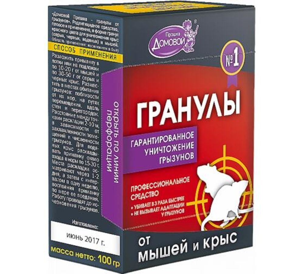 позволяет ликвидировать крыс (серых, черных, водяных) и мышей в быту. Оказывает мгновенное действие. Не вызывает адаптации у грызунов.