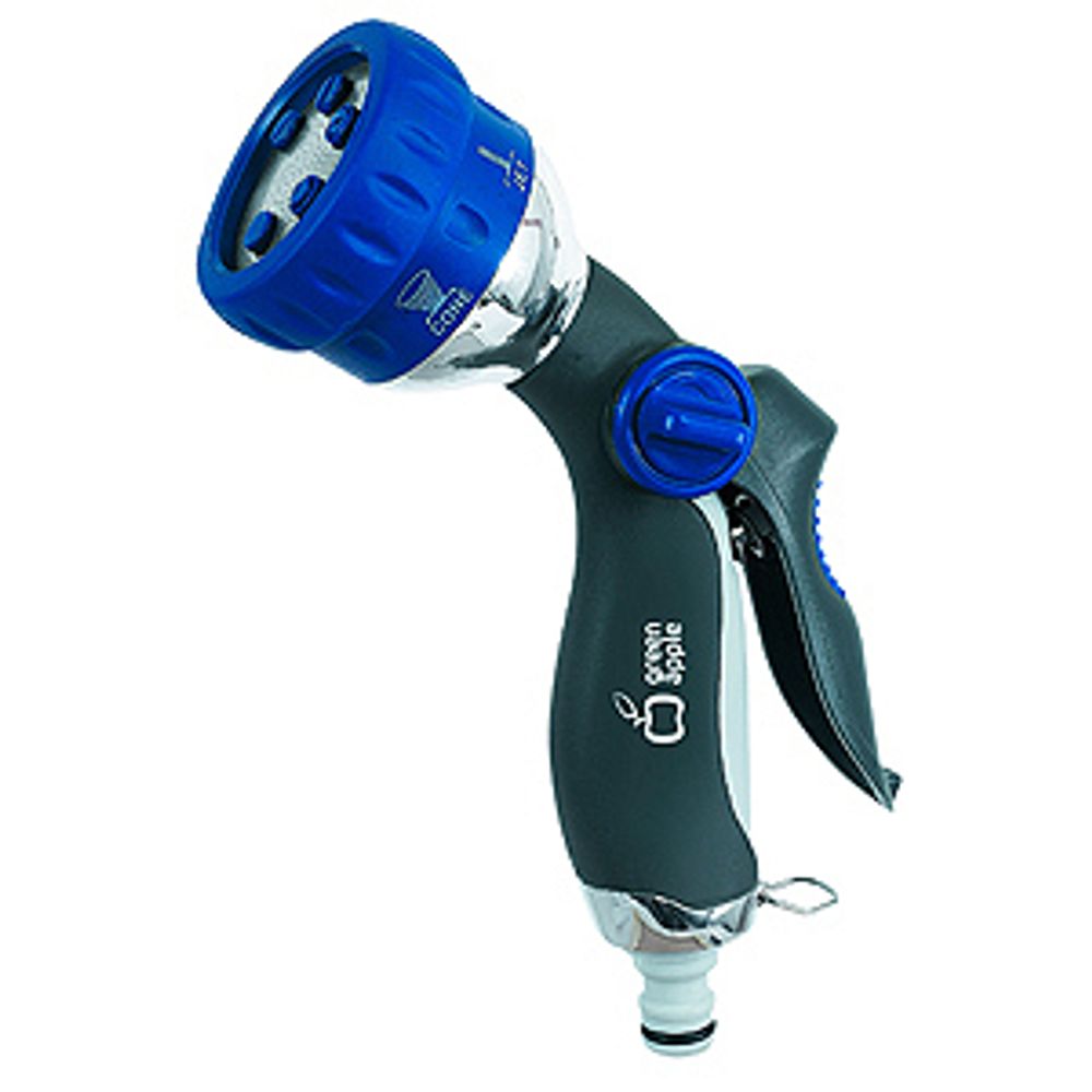 Снабжен регулятором изменения интенсивности струи и фиксатором для длительного полива.