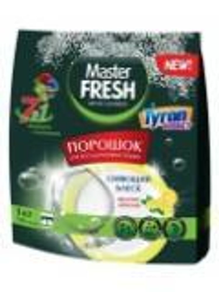 Новейшая формула порошка специально разработана для домашних посудомоечных машин всех типов. эффективно очищает любые, даже застарелые загрязнения; функция соли смягчает воду и защищает внутренние детали от накипи; функция ополаскивателя не оставляет на посуде разводов; -функция защиты стекла бережно очищает стеклянную посуду от пятен и помутнений; функция защиты серебра защищает столовое серебро от помутнений;- активный кислород удаляет пятна от чая и кофе;- функция защиты стали эффективно и бережно удаляет жир и грязь с нержавеющих покрытий посуды. Состав: 30% фосфатов, 30% карбонатов, 5-15% отбеливателя на кислородной основе, энзимы, ароматизатор. Способ применения: удалите с посуды остатки пищи и загрузите в машину согласно инструкции производителя. Засыпьте порошок в специальный отсек для порошка в вашей машине, затем закройте отсек и запустите программу мойки. Мастер фреш для посудомойки 1000 г