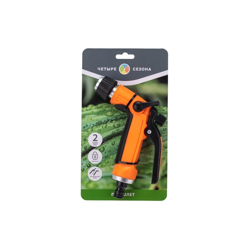 Пистолет представляет собой садовый аксессуар, предназначенный для полива растений и почвы. Выполнен из качественного и прочного пластика, устойчивого к воздействию внешних факторов. Устройство оснащено эргономичной ручкой, благодаря которой пистолет удобно и комфортно держать в руке. Имеет 2 режима подачи воды, регулируемых поворотной головкой.