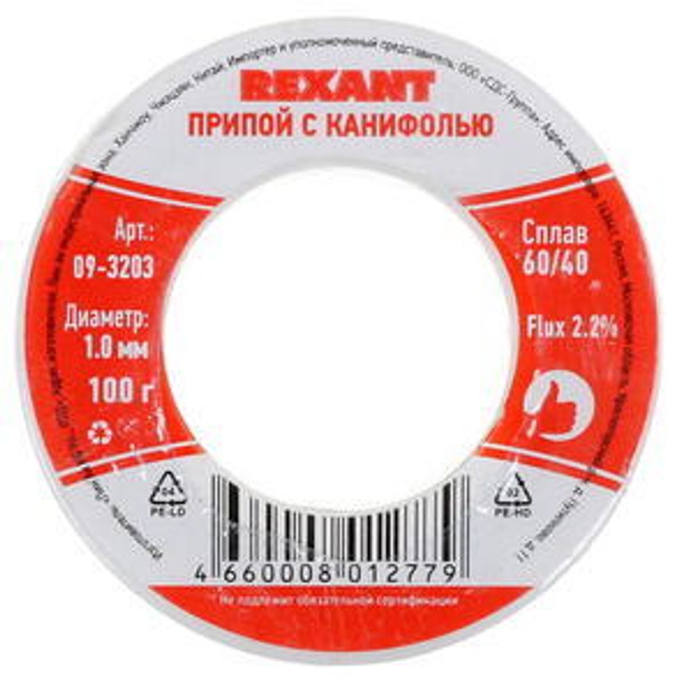 Припой с канифолью REXANT, 100 г, Ø1.0 мм (09-3203)