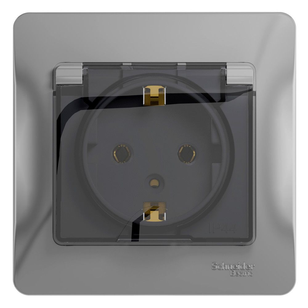 Розетка одноместная Systeme Electric Glossa Алюм с/з со шторками,с крышкой (в сборе с рамкой) 16А IP