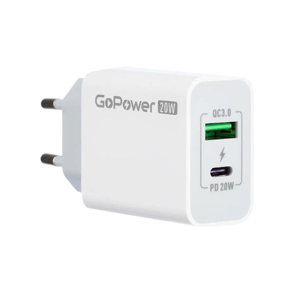 Зарядное устройство сетевое GoPower GPQC08 1USB+1Type-C 20W QC3.0 белый