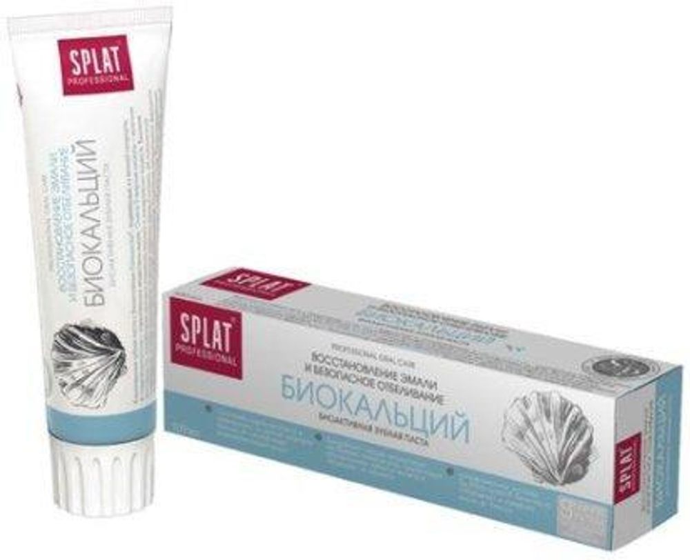 В составе зубной паст SPLAT серии Professional Биокальций входит система безопасного отбеливания SP.White System®: округлые частицы диоксида кремния, фермент папаин,